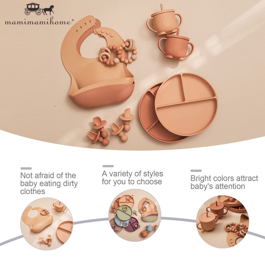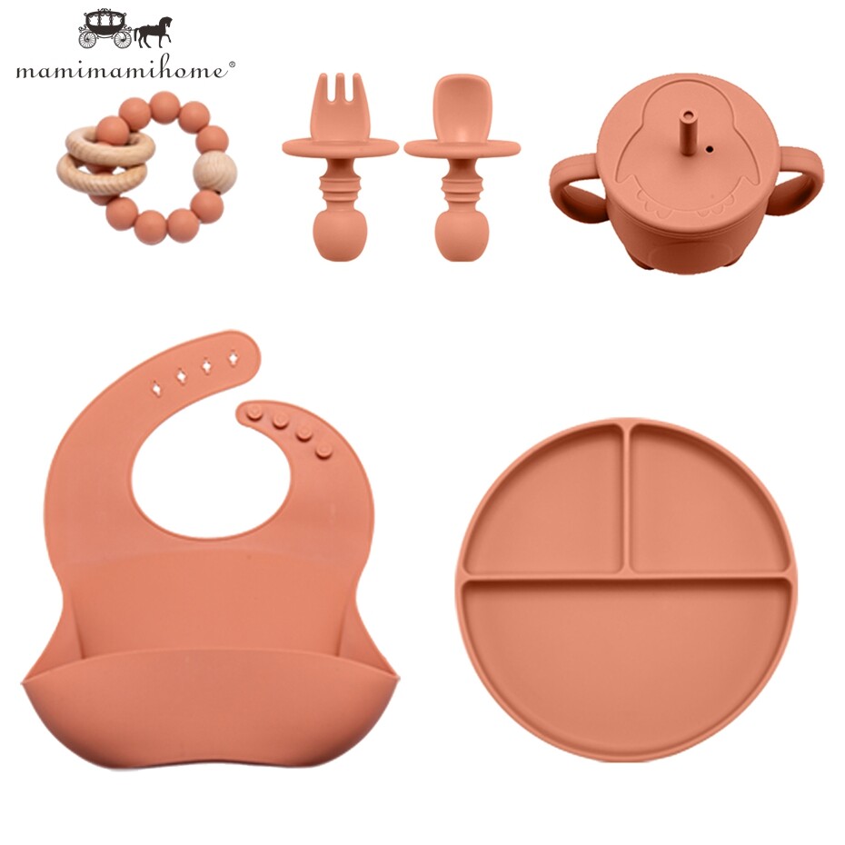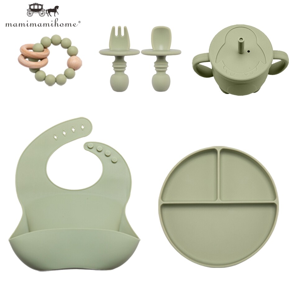 Mamimami Home Baby Feeding Meal Set 5pcs 100% Silicone Anti-fall Suction Plate,Spoon & Fork,Sippy Cup,Soft Bib
