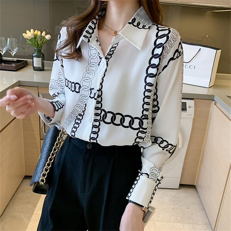 Loose Shirt Women Long Sleeve Fashion Blouse Printed Chiffon Polo Collar Korean Top Lady Clothes