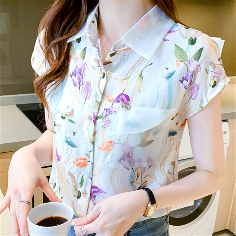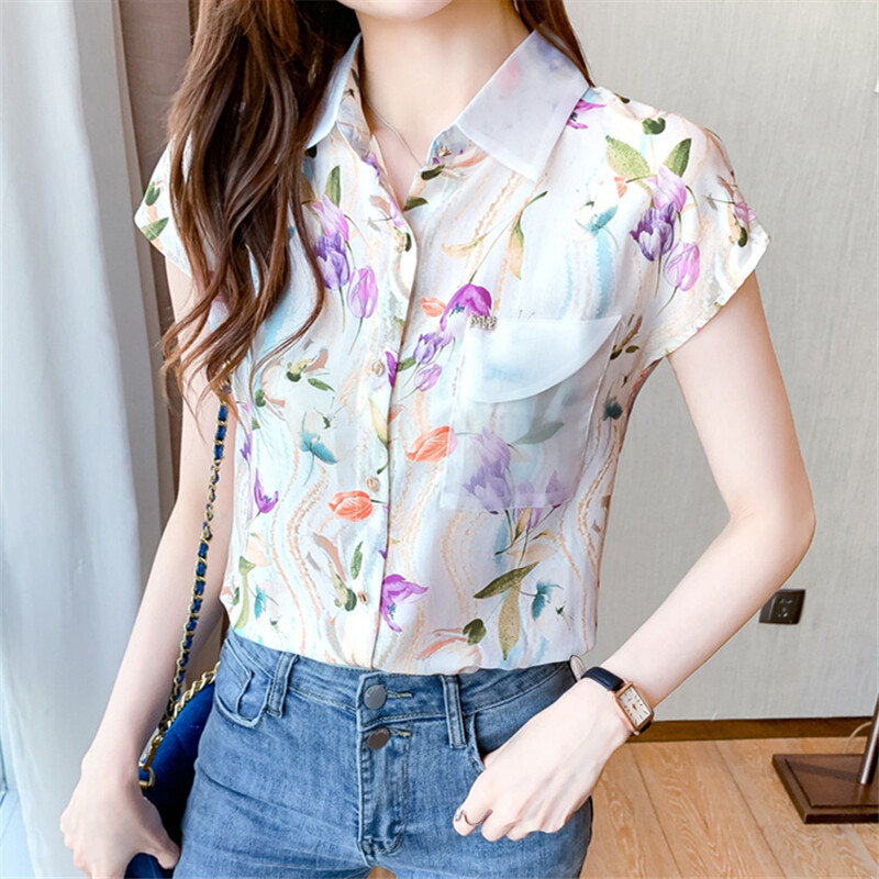 Casual Shirt Women Korean Style Plus Size Loose Top Chiffon Short Sleeve Floral Blouse Summer Shirts