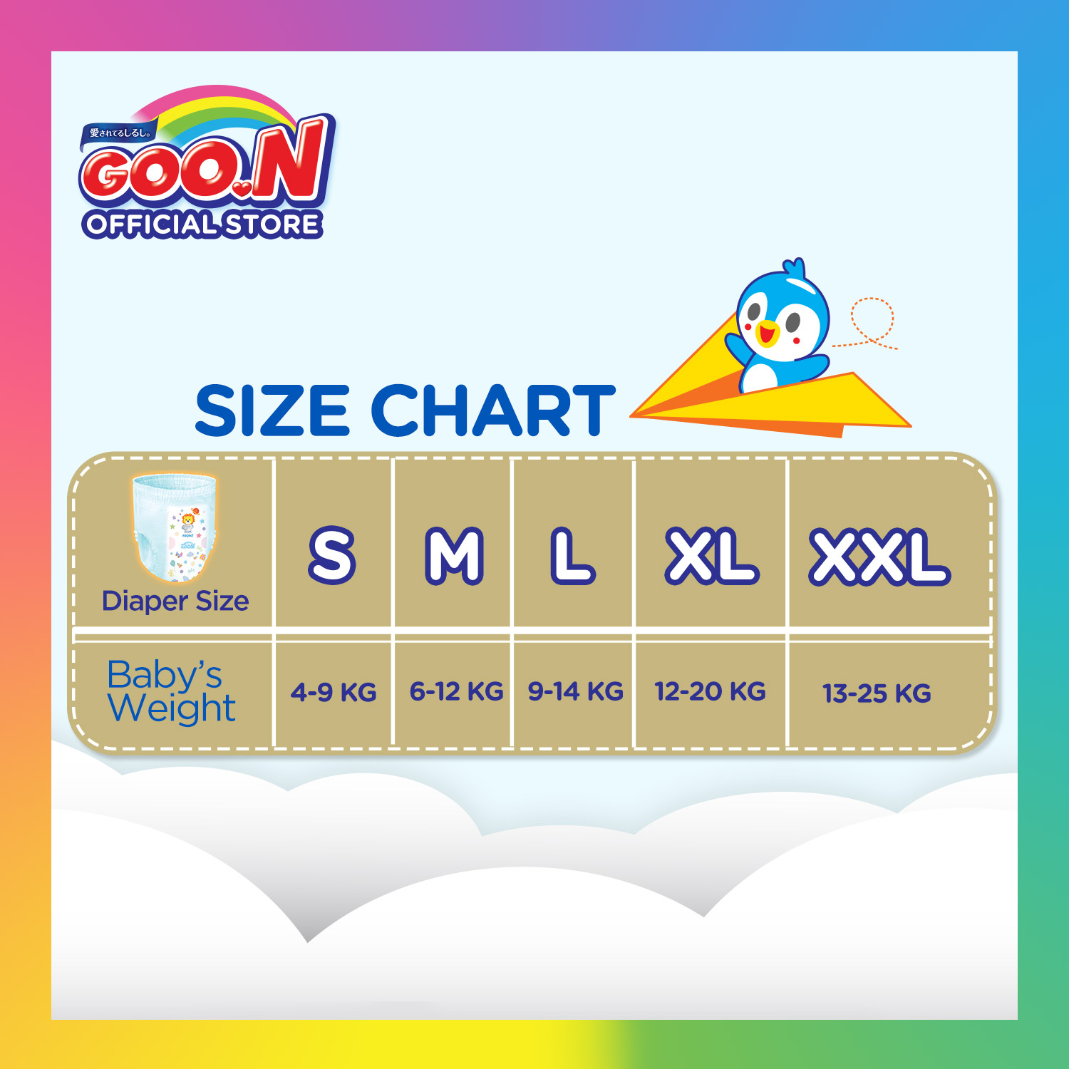 GOO.N Baby Diaper PANTS Super Jumbo Super Premium Range- NB/S/M/L/XL Size- 100% Made in Japan- Japan Quality1) 6 Cups- The extra absorbent pad allows almost instant liquid dispersion providing baby with highest quality absorbency.2) 2 Steps Block- Fitting legs guard provides ultra-protection against leakage giving your baby the confidence in their active movements.3) Gentle Soft- " 3D Dot Embross " surface technology provides gentle touch and superior dryness for your baby's sensitive skin.4) Indicator Line- " Indicator Line " turns blue whenever liquid is absorbed.NB carton: 6packs / 216pcsS carton: 4packs / 200pcsM carton: 4packs / 256pcsL carton: 4packs / 216pcsXL carton: 4packs / 168pcs