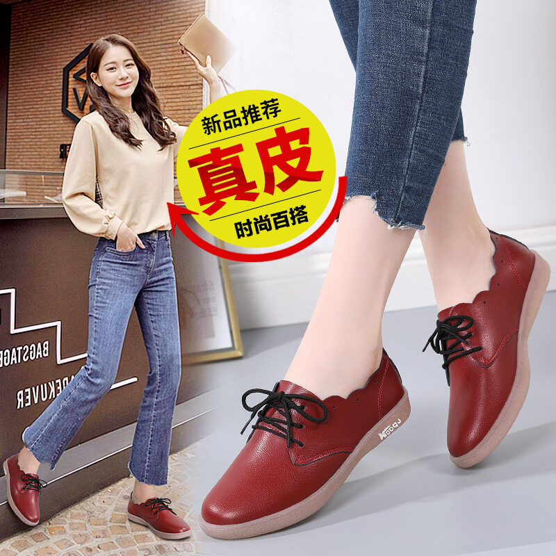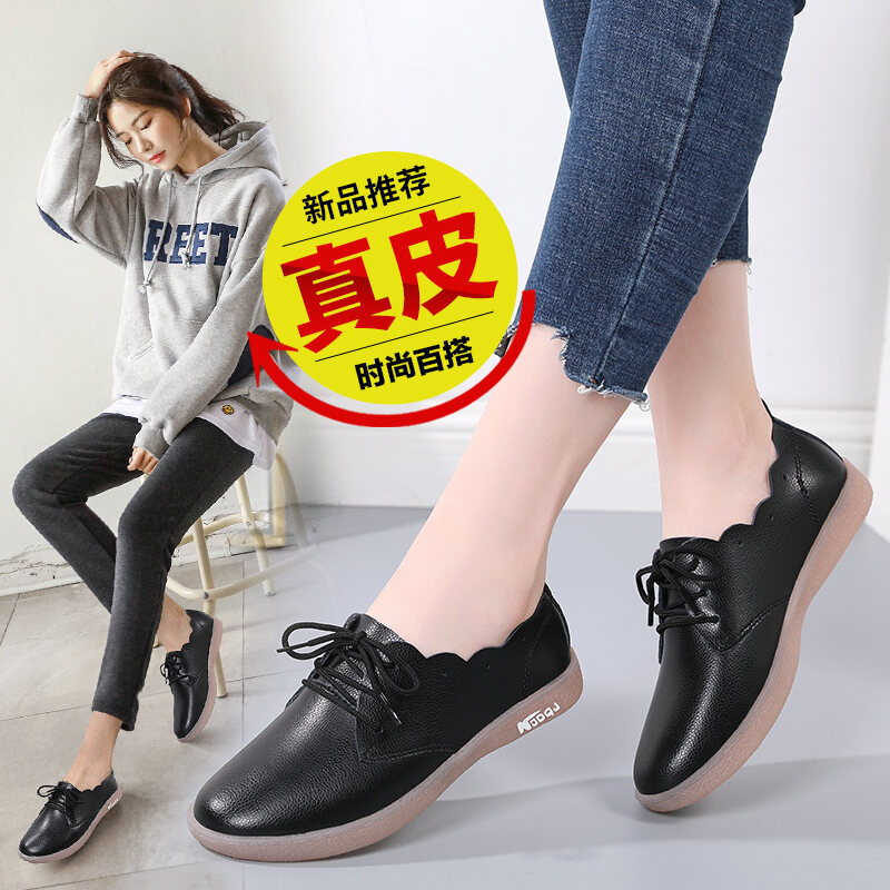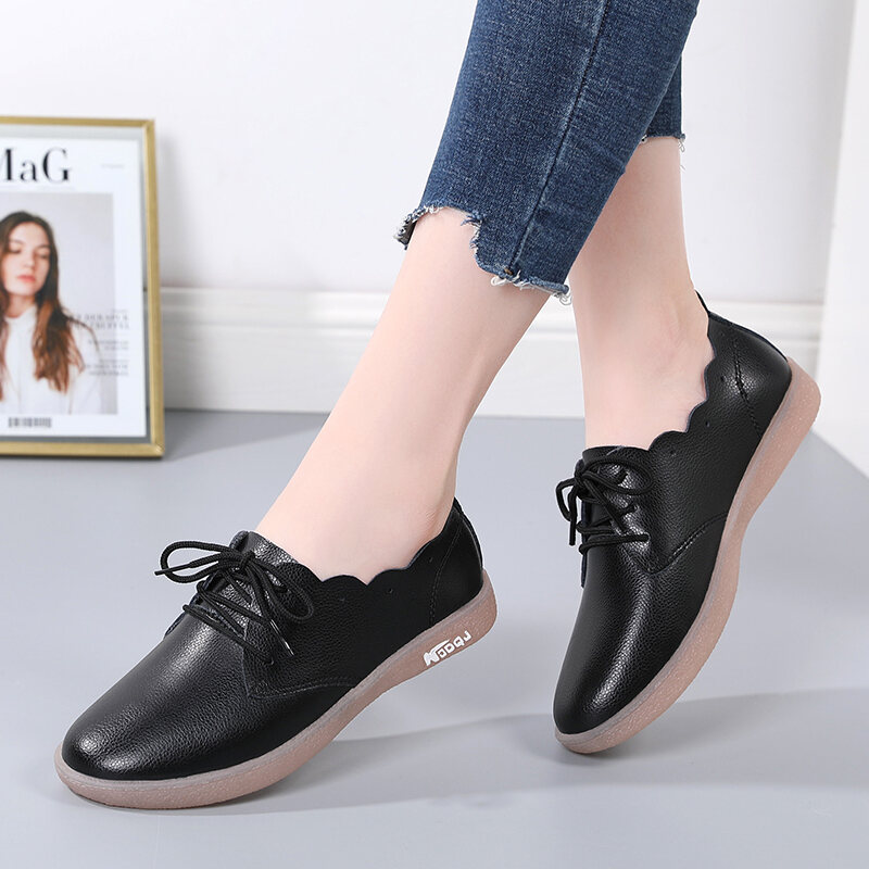 Genuine Leather Shallow Mouth Flower Flat Heel Casual Sneakers Women's Korean-Style Flat White Shoes Lace-up round Toe Non-Slip All-Match Women's Shoes