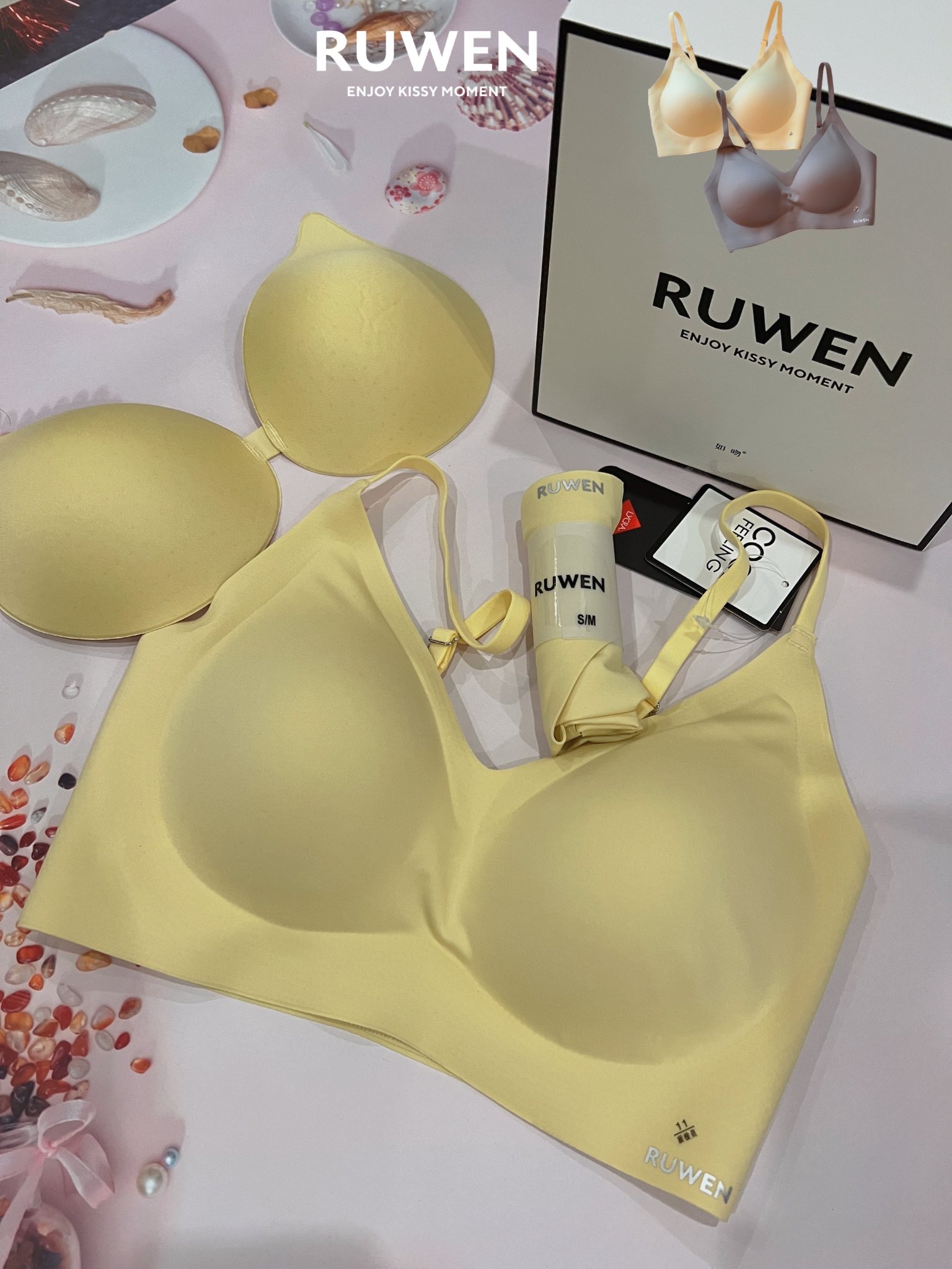 One set includes: Bra, thin chest pad, thick chest pad, Panty, dust bagDifferences between new and old kissy modelsFabric:The old vest is 100 pieces of modal + high elastic silk nylon.The sling is dry cool silk nylon"Jinkang yarn and Lycra spandex" are added on this basis.️Body sensation:Vests are very skin friendly.The old sling style is slippery and cool, which makes it more comfortable in summer or sports.Because the fabric upgrade of the new sling is different from before, it has no cold silk effect and is more skin friendly, which is more durable than the old one.️Coasters: all have a pair of thin and thick chest cushions.The old thick coaster is a separate style.The new style is "even Cup". The left and right coasters are connected in the middle, so the gathering effect will be better. The thick mat material is added with constant temperature fiber ball on the original basis to adapt to temperature regulation and make it more comfortable.️Quantum chip and negative ion functionThe old underwear has quantum chip and local negative ion coating.The new upgrade does not have a quantum chip, and it is a complete set of negative ions.Fabric upgrade the newly added fabric Jinkang yarn has the functions of microcirculation and negative ion release, and it is "exclusive license of patented products", because the two functions are similar. Finally, Jinkang yarn was used to replace quantum chip. It can also avoid the metal reaction that may appear because the old quantum chip has passed the security inspection. Replace the previous local negative ion effect with a whole set of negative ions.️The newly upgraded products are made of super fine yarn yarn with high density, so the sand feeling of cloth surface can be displayed. Generally, sand thread can not do this effect, and basically, the high-end brands in the market will use this technology.The upgrading of a product is based on careful consideration, material selection and process design, as well as market research. If you want to stand out in the same kind of products, you need to differentiate from the market.This process can make the overall light sense of the product more high-end, and the wearing experience more comfortable and breathable, and can also better solve the problem of gathering effect.