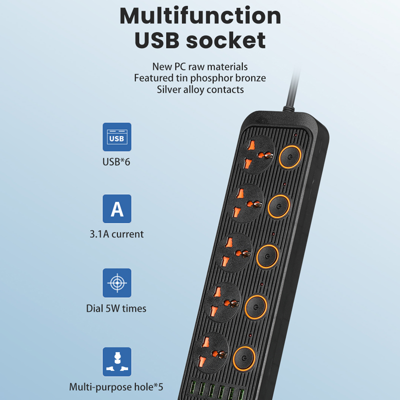(Gift)JFKDX A06 UK Plug 3000W Power Strip 3 Universal Outlet+6 USB Extension Socket 3.1A Separate Switch Wall Mounted For Home Office With 2 Meter Power Socket