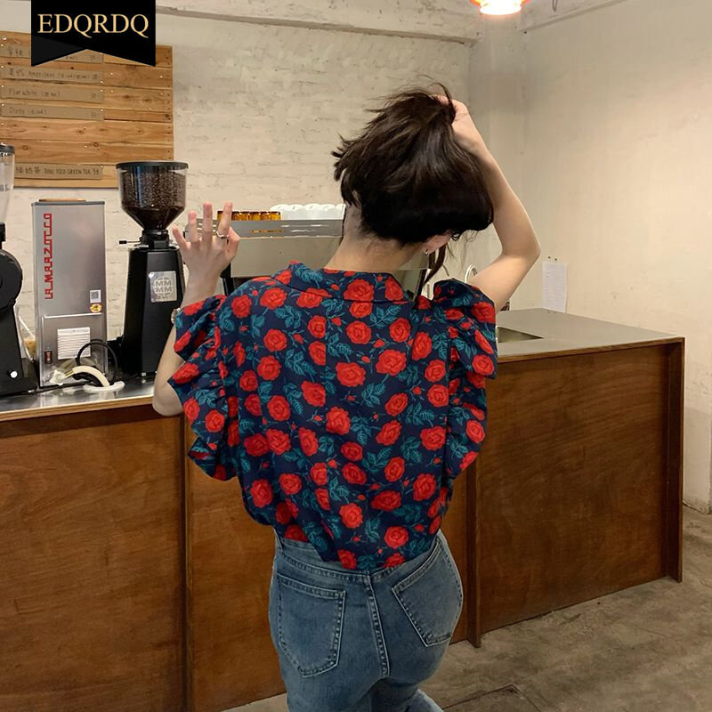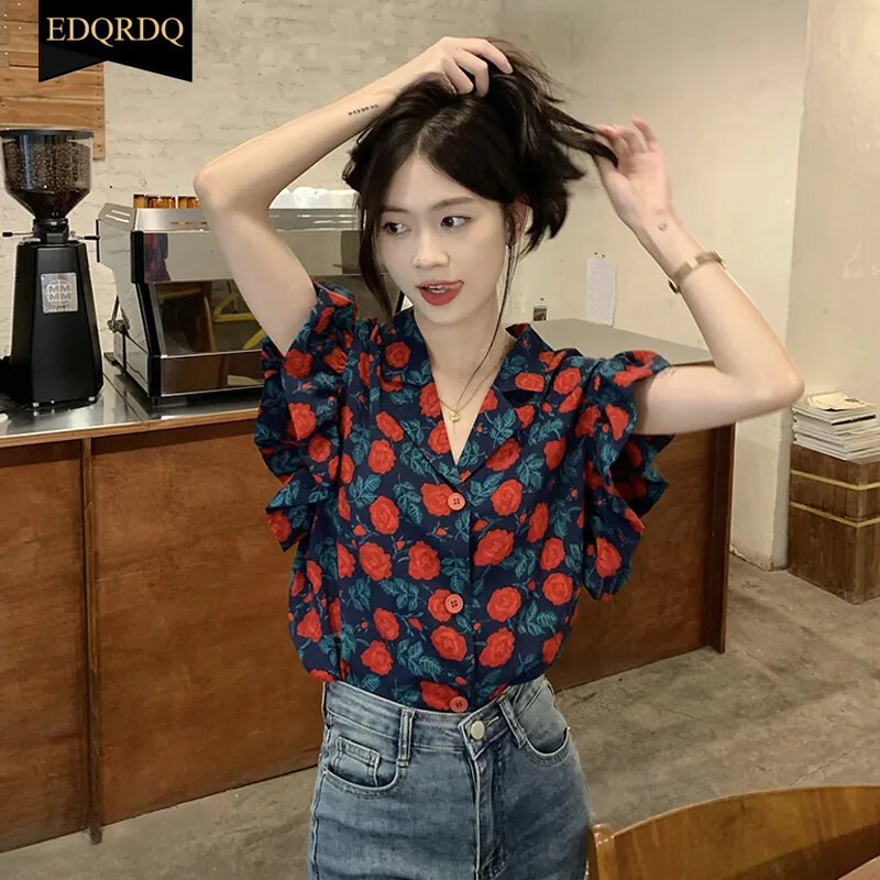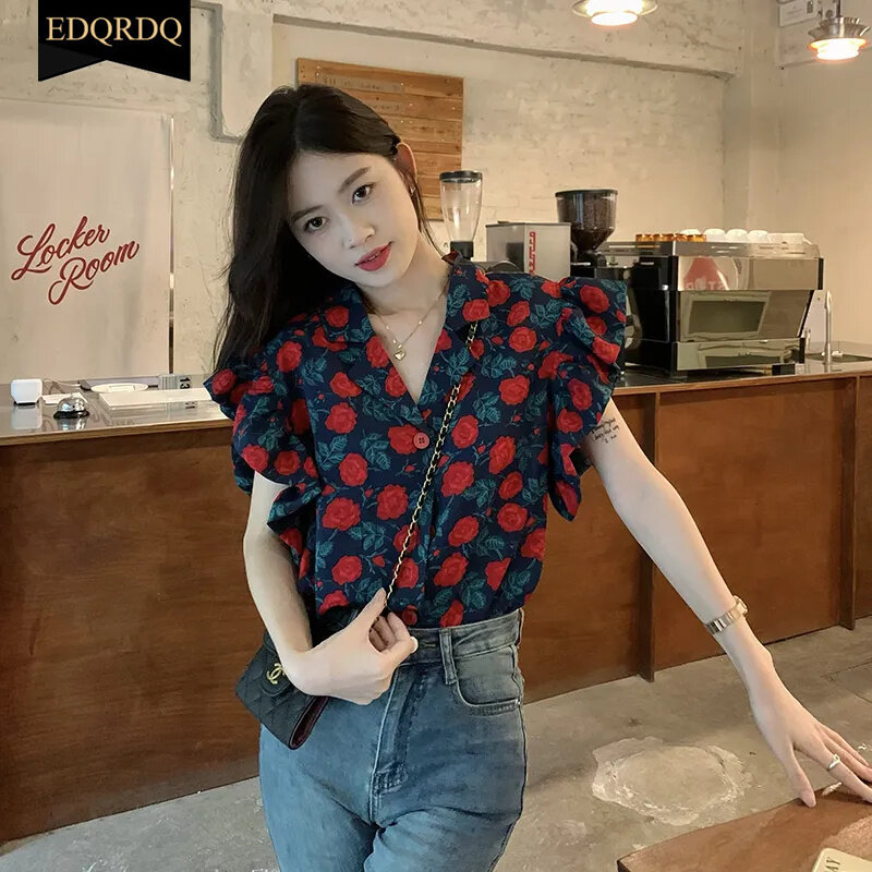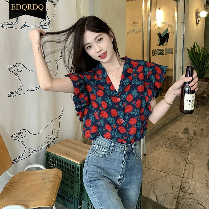 EDQRDQ Floral Tops Ruffles V Neck Petal Sleeve Batwing Blouses for Women